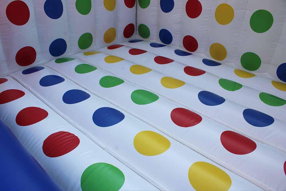 Maintaining the vibrant green, blue, yellow, and red dots reminiscent of the 80s Twister version, 3D Twister introduces an innovative inflatable space. Here, the colorful dots are not confined to the ground but extend up three eight-foot walls, promising a whirl of excitement.