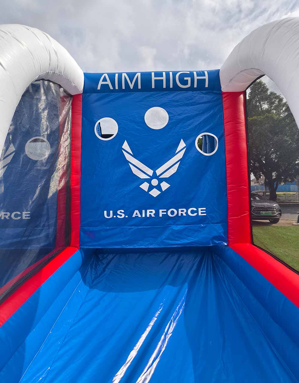 Brand with your color choices and even your logo for our 2 player inflatable football toss. Popular at camps, schools, and company team building events. This large inflatable football toss will for sure be a big hit.
